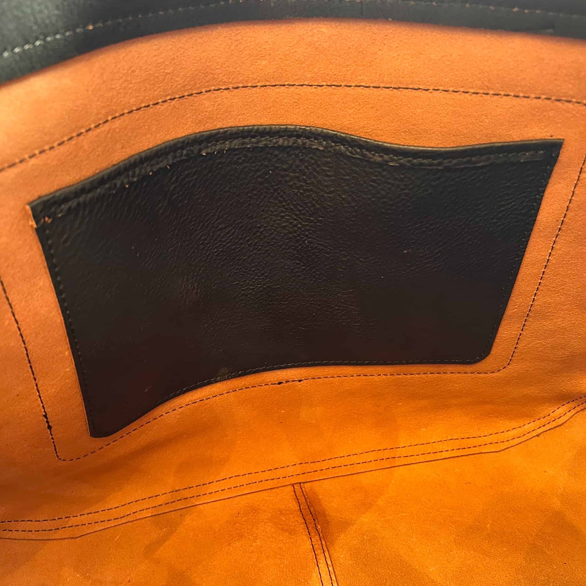 定番品のニュースペーパーバッグを茶芯レザーで仕立て、一部仕様変更をしているモデルになります。